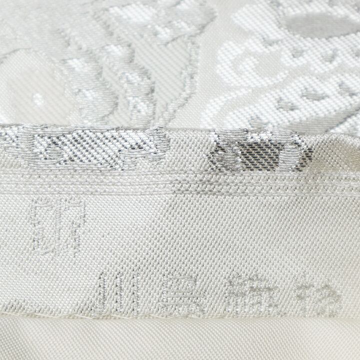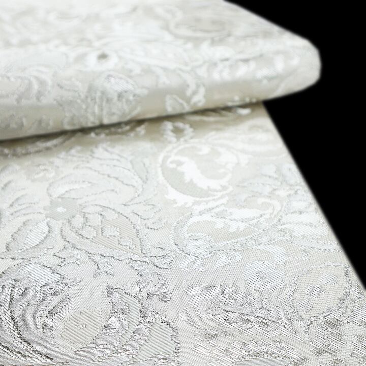 プラチナのように高貴に艶めく帯地に、優雅に織り描かれた曲線美。