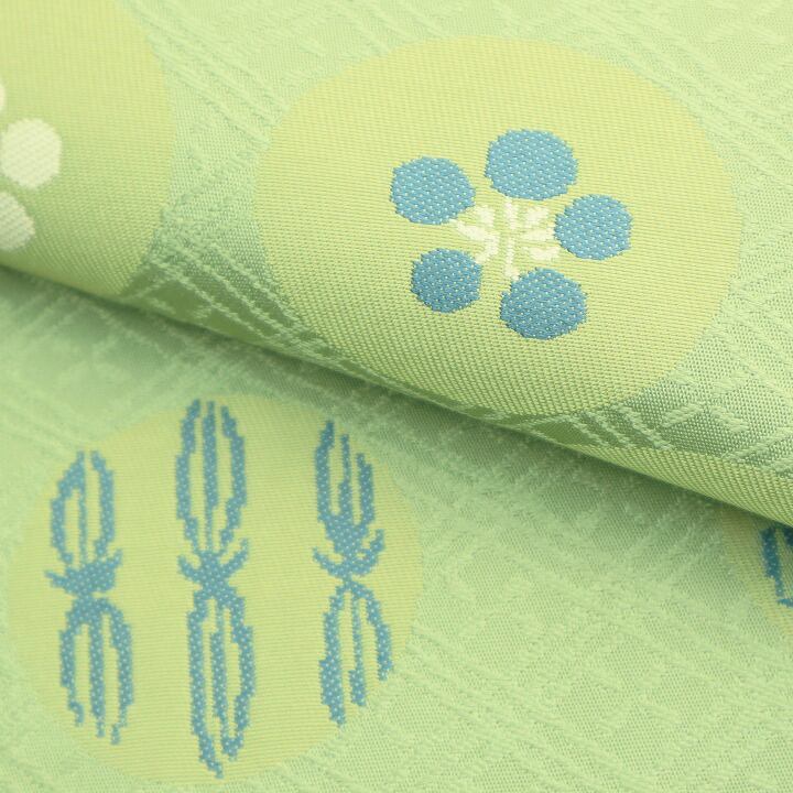 まるで新緑のように艶めく帯地と、どこか愛らしいアイコニックなモチーフが上品に映える仕上がり。
