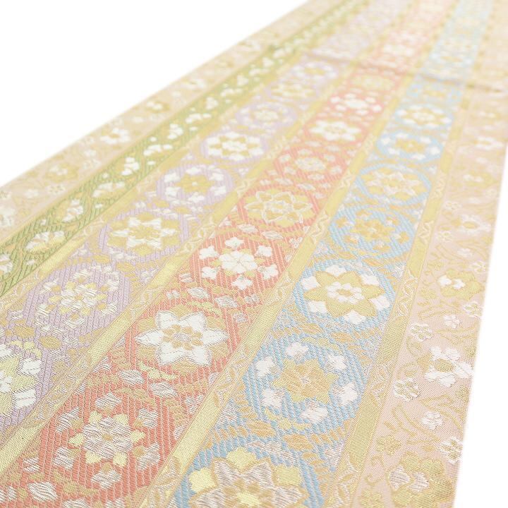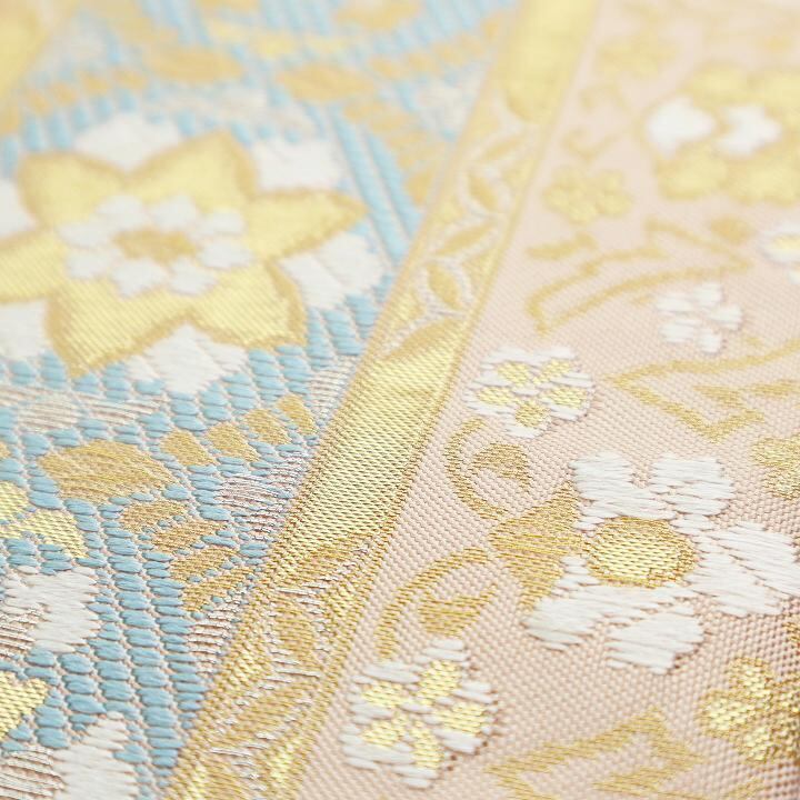 大人気モチーフ【華文】を間道文様に織り成した帯地には、高貴に艶めくゴールドを添え、爽やかな水色や若草色、コーラルピンクやラベンダーなどの、優しくも華やかな彩りに包まれて。