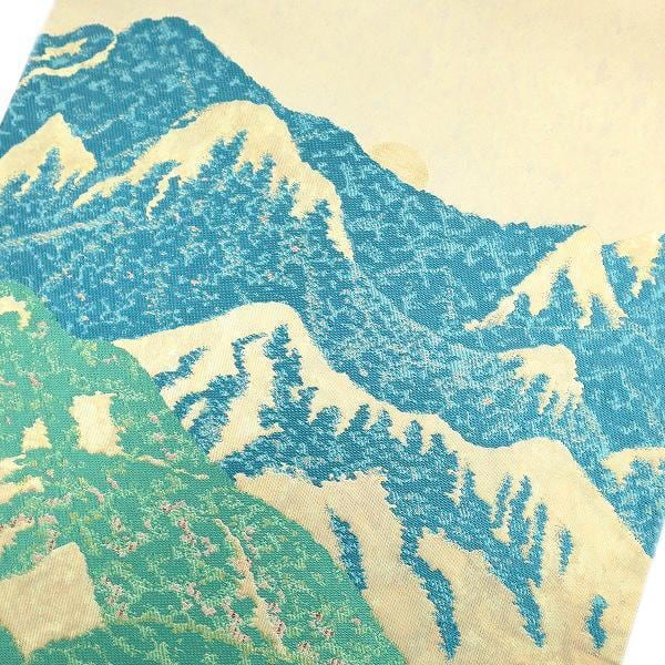 艶やかな帯地に山々と太陽が美しく映え、これ以上はないほどの格調高い色合いに染め成して。