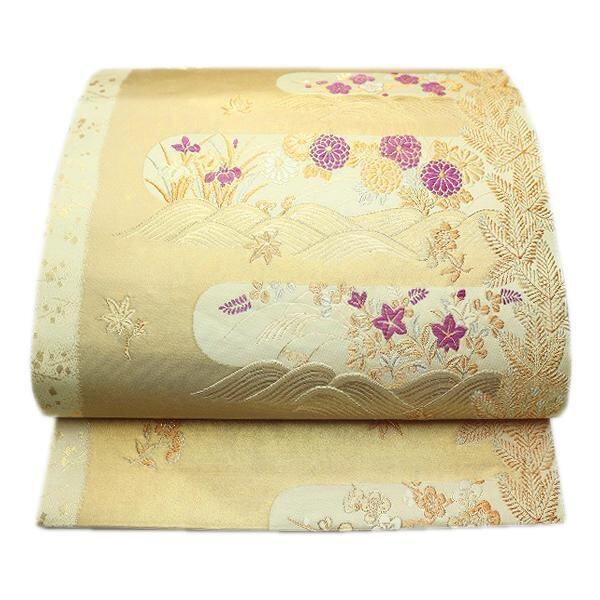 上品な艶めきを湛えた、シャンパンゴールドの帯地。