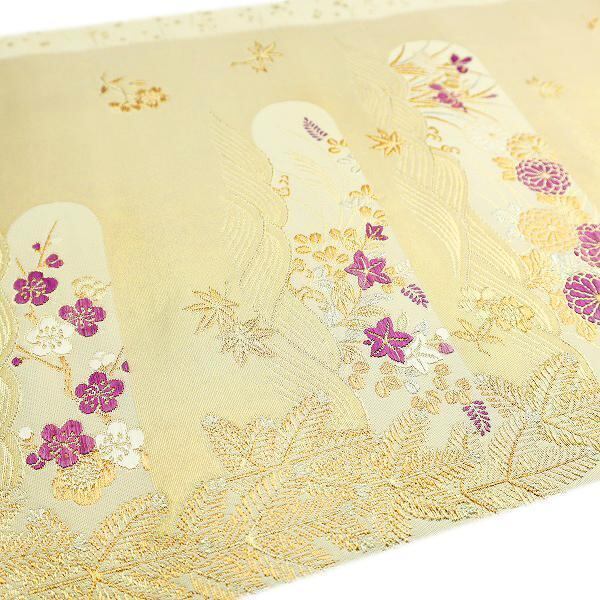美しく咲き誇る四季折々の花と、まるでゴールドのように煌めく帯地とのコントラスト…。
