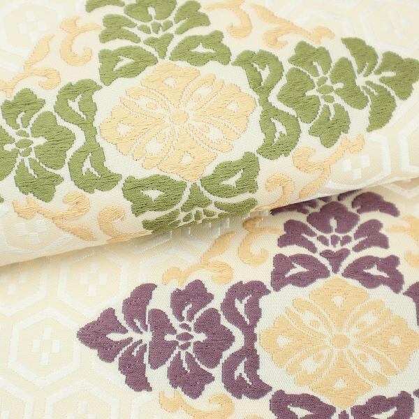 また喜多川作品は白地が多いのですが、こちらの作品は優美なお色目アイボリーを基調としておりますので、お締めになる季節や合わせる着物や小物を選ぶことのない優れもの。