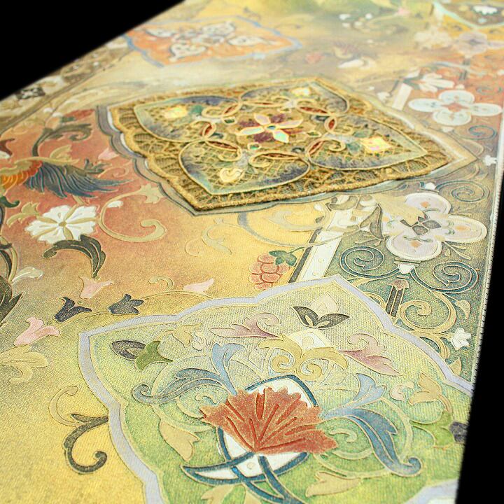 またこちらのお柄は、龍村平蔵さんの作品にも見られる、とても高価で希少性の高い『金唐革』を模して丁寧に織り成されており、格式の高さを感じさせられる豪華な仕上がりに。