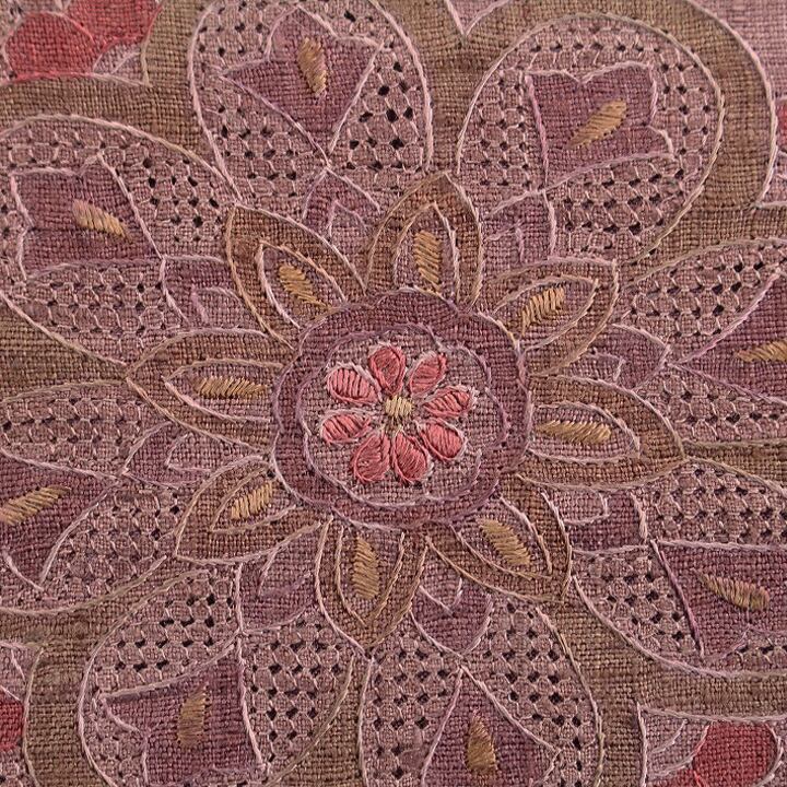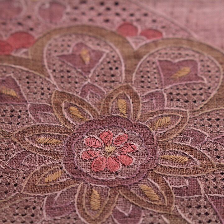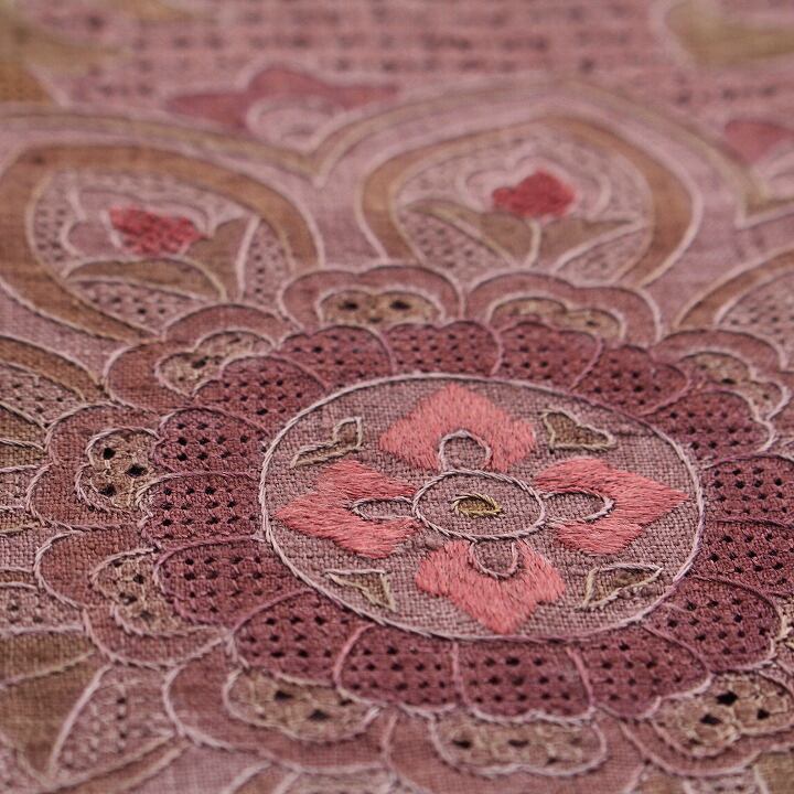 織りや染めで描かれたお柄のアクセントに、一部刺繍が施されているお品にはお目に掛かりますが、こちらの帯は全てのモチーフが【蘇州刺繍】と【スワトウ刺繍】のみによって表されている、とても贅沢なお作り。