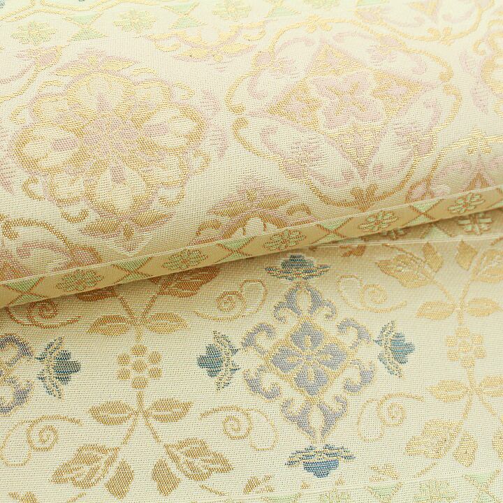 ほんのり淡いクリーム色の帯地に、上品に煌めく美しいモチーフの数々…