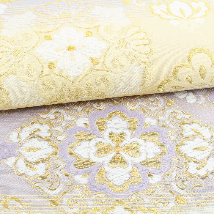 艶やかな光沢を湛えた帯地には、共糸による有職文様や華文などの大人気モチーフを織り成し、幅広いシーンにご着用頂けるお使い勝手抜群の仕上がりに。